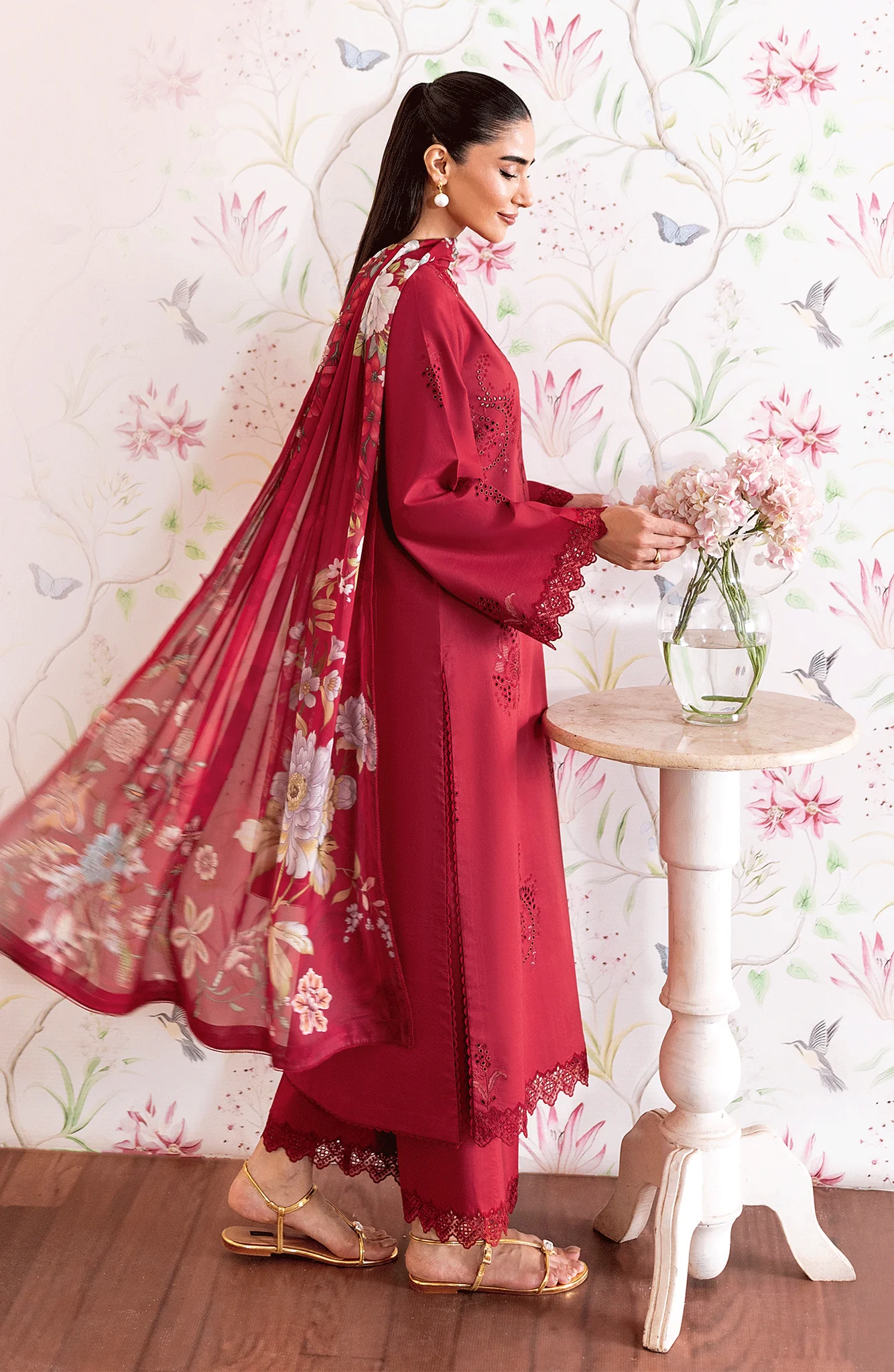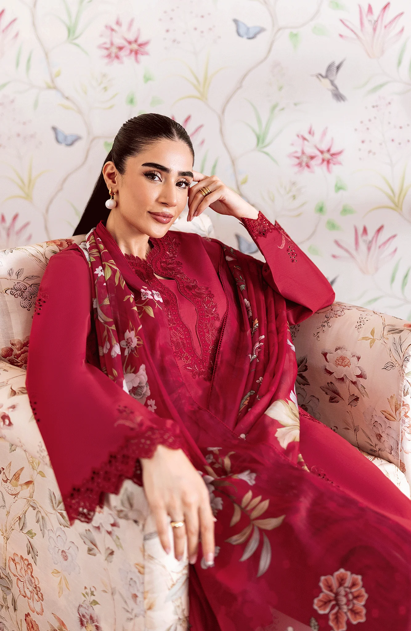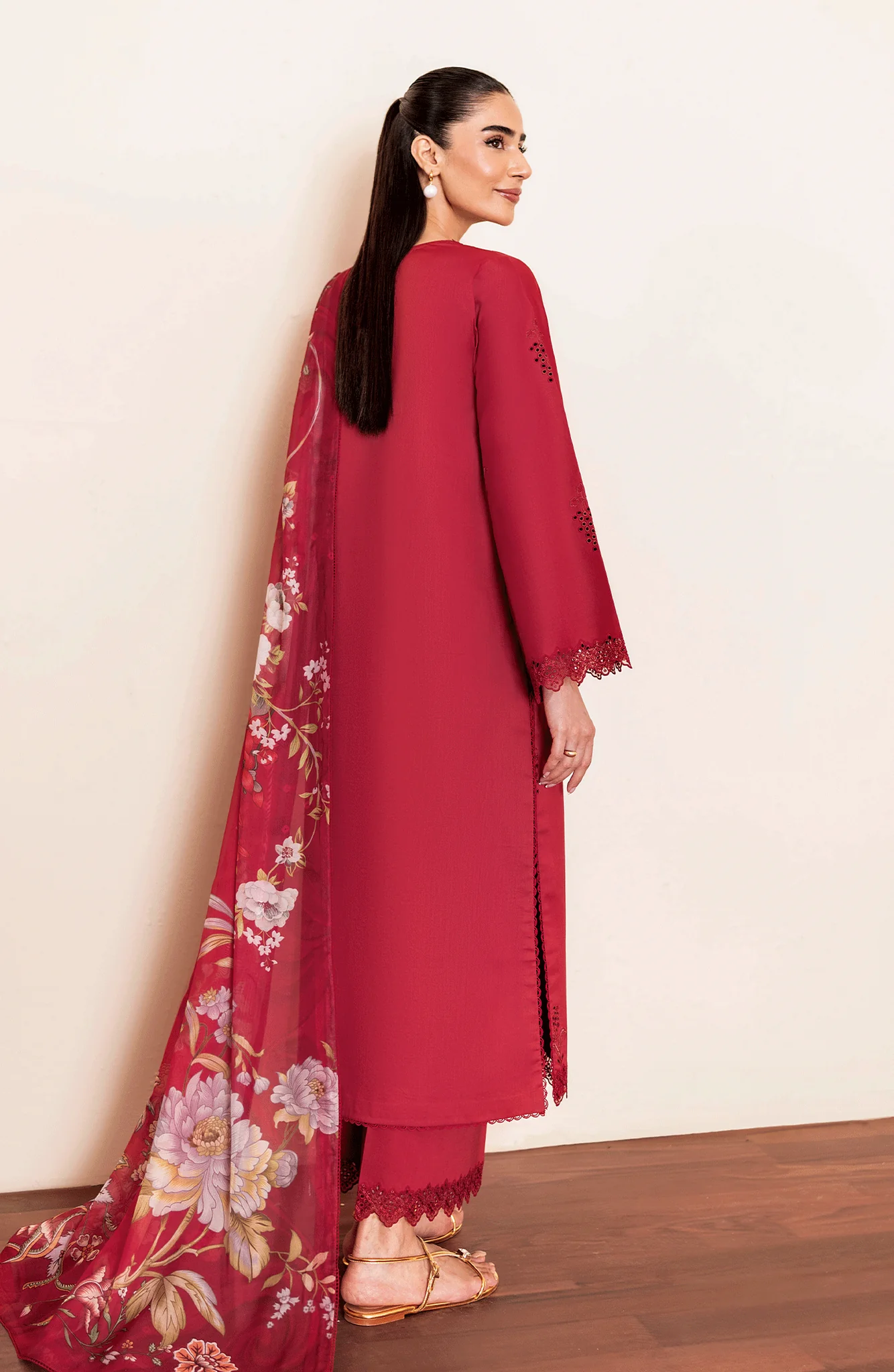 A bold statement in red, Crimza is where tradition meets elegance. This three-piece outfit features a fully embroidered front, with intricate detailing on the neckline, sleeves, and hem—offering timeless charm with a modern edge. The plain matching trousers are enhanced with delicate embroidery at the hem for a graceful finish. Paired with a digitally printed silk dupatta blooming with floral printed motifs.