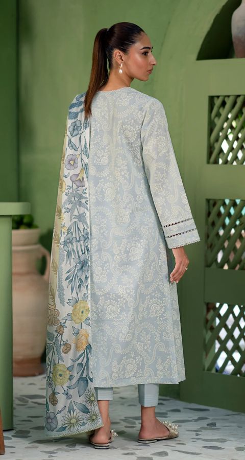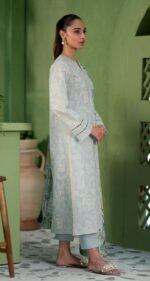 In a serene ice blue hue, this three-piece set features a screen-printed shirt with delicate embroidery along the side borders, adding a touch of elegance. Paired with a plain dyed trouser, the look is completed with a luxurious silk dupatta, offering a refined and sophisticated ensemble.